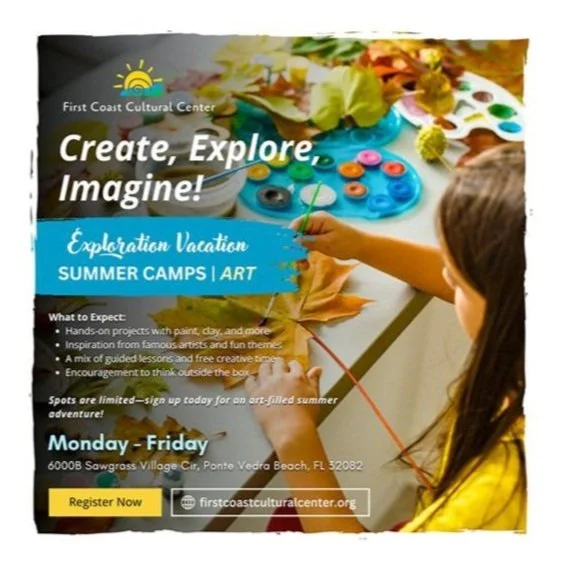 The digital posts for First Coast Cultural Center's Summer Camp feature engaging and visually appealing layouts that highlight the culinary, arts, and drama workshops. Bright, playful, and dynamic to capture the attention of parents and children, ensuring that key details are easy to find while maintaining a sense of excitement and creativity.
